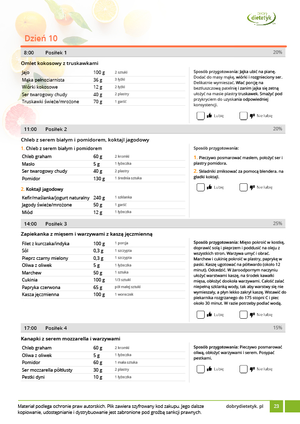 w formie precyzyjnych jadłospisów wielodniowych (na każdy dzień miesiąca jest opracowany osobny jadłospis). Tutaj nie musisz zastanawiać się co zjeść każdego dnia, gdyż będziesz mieć dokładnie wszystko rozplanowane.